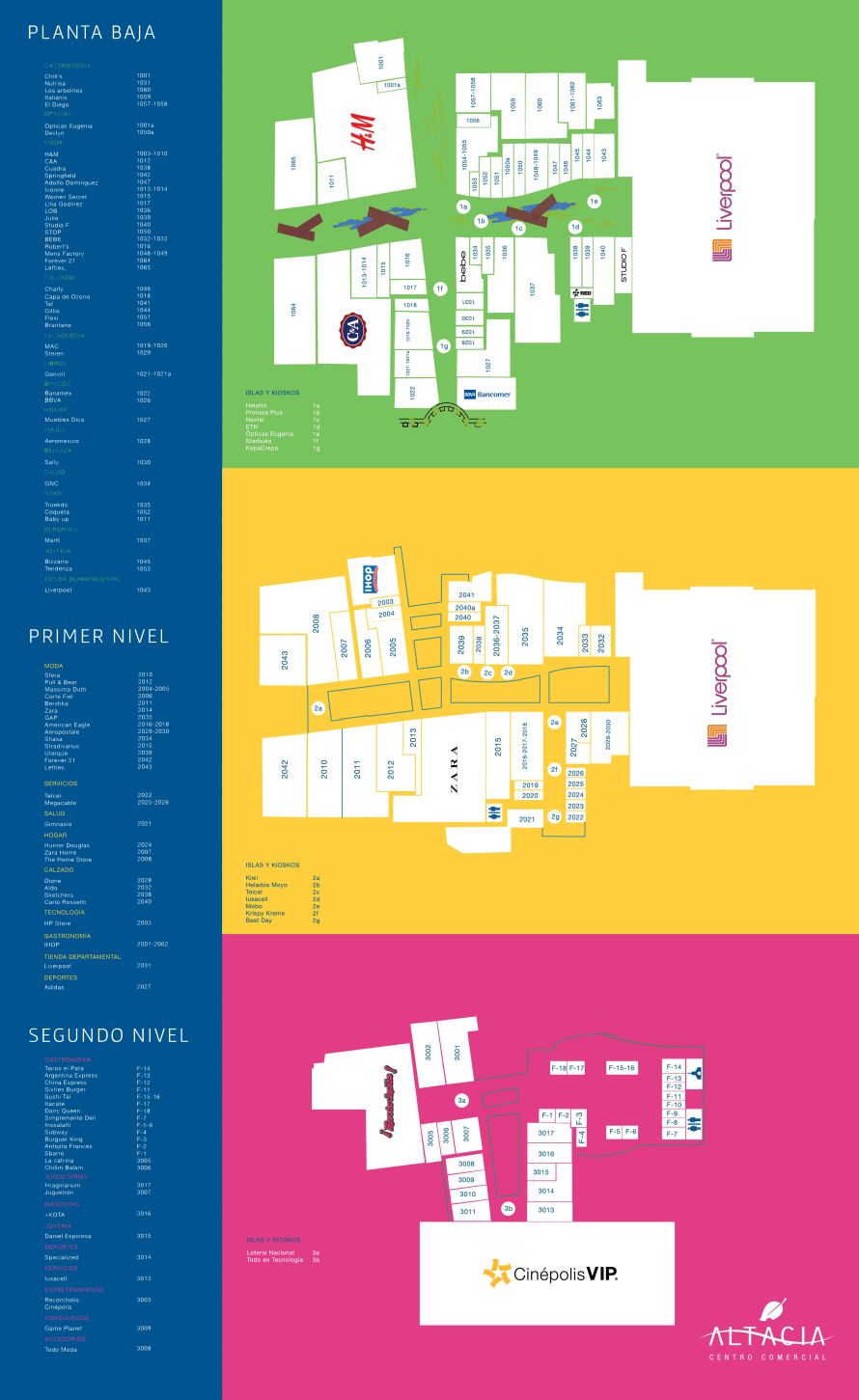 Centro Comercial Altacia ofrece más de 93 tiendas. Centro Comercial Altacia se encuentra en la dirección: Blvd. Aeropuerto No. 104, León, Guanajuato - 37530, México. (GPS: 21.092484, -101.626572).